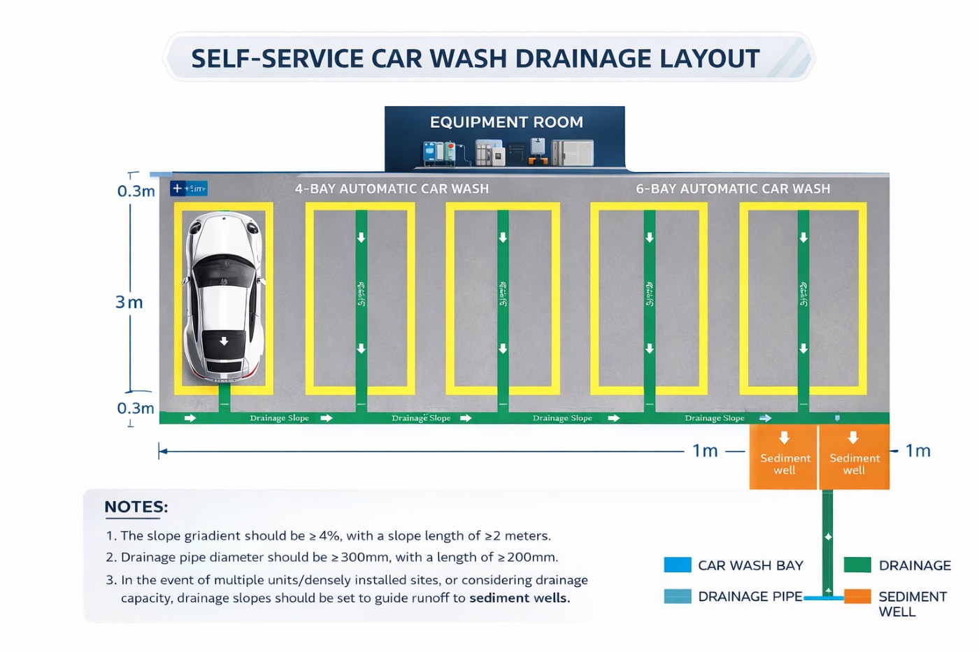 Projeto profissional de drenagem para lava-jatos self-service, garantindo fluxo de água eficiente, separação adequada de sedimentos e operação estável a longo prazo.